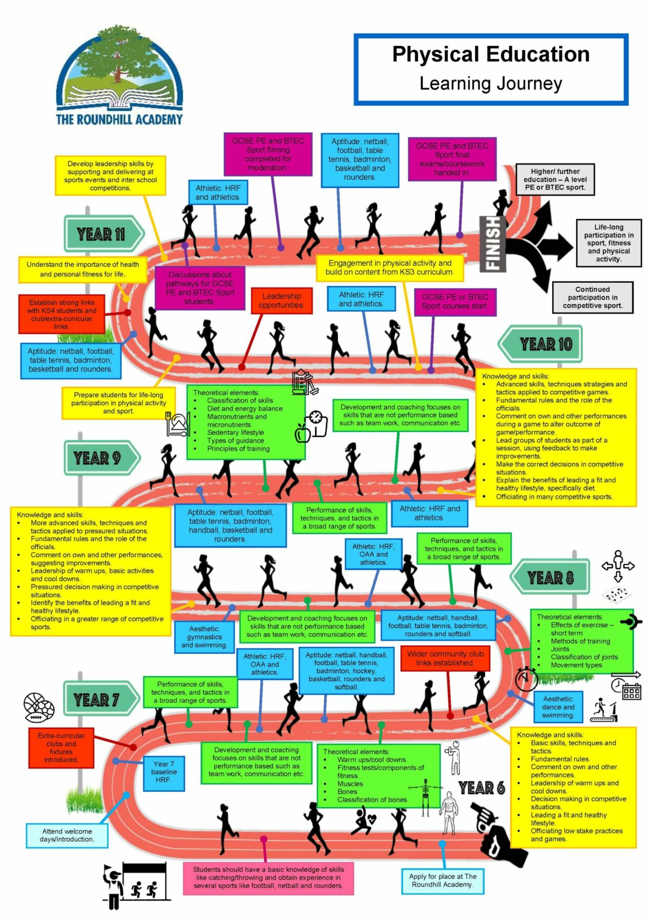 | Athletics | Students learn the basic techniques of the sprint start, running style and pace and the various basic techniques of athletics events such as the 100m, 200m, 400m, 800m, Shot Putt, Javelin, Relay, Long Jump and High jump and then students apply their learning to aim to improve their personal bests. In the 400m and 800m they will learn tactics of how to perform at their personal best and in each event they will learn the rules and importance of safety. |